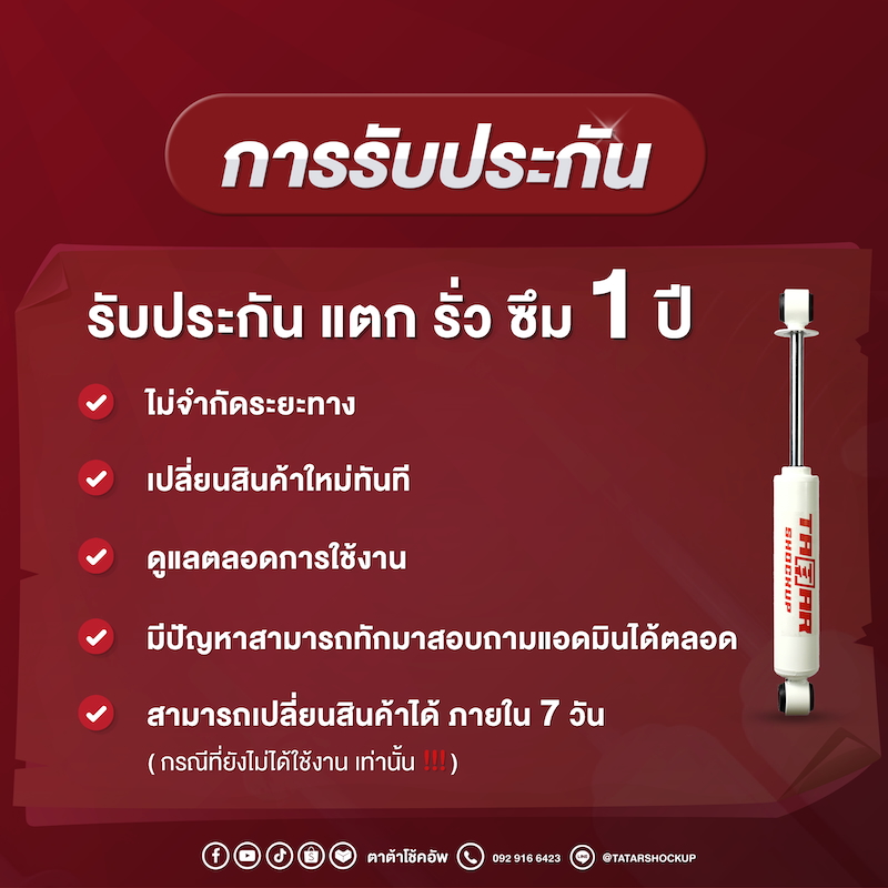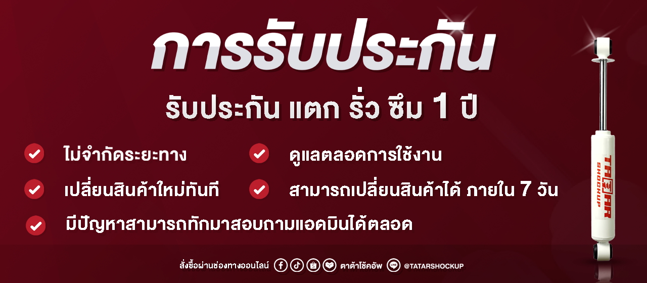 ตาต้าโช้คอัพ รับประกันโช้ค 1 ปี จากสาเหตุ โช้คมีอาการรั่ว ซึม หรือ แตก (จากการใช้งานตามปกติเท่านั้น) โดยจะมีการเคลมโช้คตัวใหม่ให้ทันที